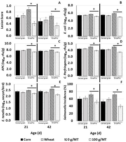 - Teirlynck, E.; Bjerrum, L.; Eeckhaut, V.; Huygebaert, G.; Pasmans, F.; Haesebrouck, F.; Dewulf, J.; Ducatelle, R.; Van Immerseel, F. The cereal type in feed influences gut wall morphology and intestinal immune cell infiltration in broiler chickens. Br. J. Nutr. 2009, 102, 1453–1461. [Google Scholar] [CrossRef]