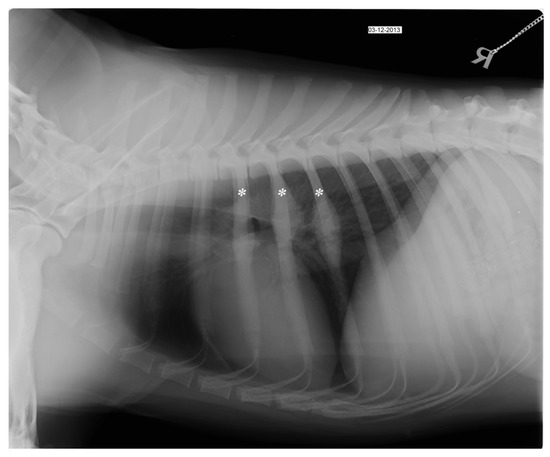 Right lateral (LL) thoracic radiograph at the day of first admission shows focal periosteal reaction of the 5th, 6th and 7th ribs (asterisk).