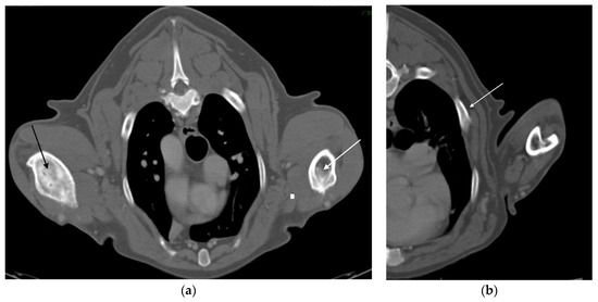 After 6 years, the dog return to the THDVM for a 2-week history of III-degree lameness of the right front limb. Physical examination showed visible hypomyotrophy on the abductor muscles and intense pain on palpation of the right forelimb while the left limb appeared normal. The medio-lateral and cranio-caudal radiographic examination of the right humeral diaphysis showed a mixture of lysis and focal sclerosis, poorly defined transition zone between the lytic lesion, marked cortex destruction, and normal bone, and irregular periosteal reaction and large presumptive neoplastic osteogenesis in the surrounding soft tissue (Figure 3a,b). Clinical and radiographic findings of the humeral lesion were compatible with bone neoplasm. The dog underwent a total body computed tomography (CT) scan to stage the suspected neoplasm. The tomographic image of the right humerus showed cortical bone destruction, amorphous periosteal productive response, with transition zones, and focal regions of hyperdensity within the medullary cavity. The pattern was compatible with a bone neoplasm of the right humerus (Figure 4a). The left humerus CT scan showed cortical bone osteolysis, regular and solid periosteal reaction as a result of a chronic osteomyelitis process. In the middle-third of the right 5th, 6th and 7th ribs and left 6th rib, a focal thickening attributable to hyperostosis was highlighted (Figure 4b). Bone biopsy of the right humeral mass and left humeral diaphysis with osteolysis, performed during CT for the histological and microbiological examination, showed chronic lymphoplasmacellular osteomyelitis with bone remodeling without identifying neoplasm or any causative agent, and hemoculture was also negative. The failure of 6 weeks of medical therapy with NSAIDs (non-steroidal anti-inflammatory drugs), gabapentin and pamidronate disodium, and the progression of the lameness led to the decision of amputating the right forelimb. By histological examination of the entire bone, a productive chondroblastic OSA of the distal right humerus with infiltration of the surrounding soft tissues was diagnosed. Histological sample showed lamellar bone tissue with irregular islands of osteoid surrounded by malignant spindle to polygonal cells, organized in carpet or short bundles supported by scarce vascular stroma with productive extracellular osteoid matrix. Cartilage differentiation was appreciated multifocally in association with large areas of necrosis. The owners refused standard adjuvant chemotherapy with carboplatin or doxorubicin. The dog underwent a metronomic chemotherapy with cyclophosphamide (15 mg/m2/SID) and firocoxib (5 mg/Kg/SID), and thalidomide at 10 mg/Kg, PO SID was administered. Eight months later the dog showed developed vertebral and thoracic metastases at CT scan restaging and was euthanized following the owner’s will.