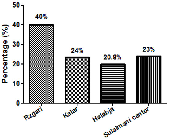 The present study was conducted in the Kurdistan Region (Sulaimani Centre, Halabja, Kalar, and Rzgary districts) of Iraq located between 35°4′ and 36°30′ latitude and 44°50′ and 46°16′ longitude. The altitude of the Sulaimani governorate is about 400 m above sea level, and 2500 m in the northern and northeastern of the province. The climate of the Kurdistan region is hot summers (the highest temperature is about 46 °C) with cold winters (the minimum temperature is about −5 °C).