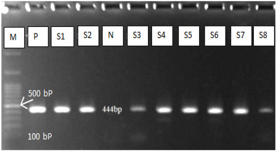 Gel electrophoresis of PCR product of E. granulosus. M = DNA Ladder, N = negative control, P = positive control, S = Sample.