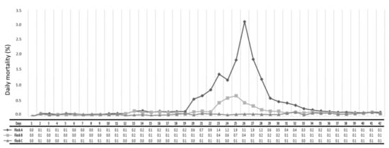 A curve of the daily mortality recorded in each of the three flocks (Flock A–C) of the farm over the rearing period. Daily measurements represent the number of dead birds divided by the population at risk.
