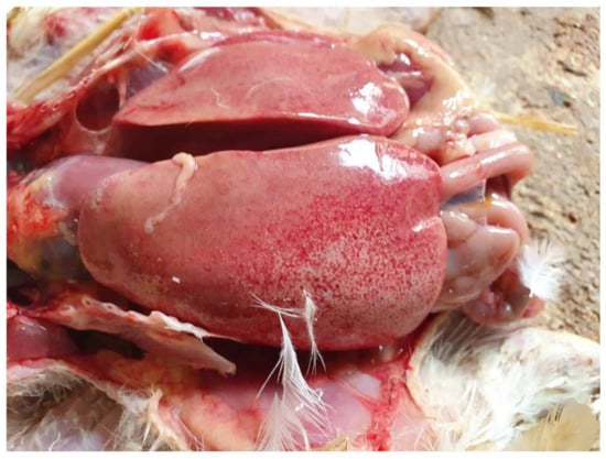 Gross-pathology findings on a 23-day-old broiler chicken, which was submitted for postmortem examination in the Unit of Avian Medicine, Thessaloniki, Greece during the IBH outbreak. The presence of hemorrhages on the skeletal muscles of the bird is visible, whereas, the liver dominates in the visceral capacity with the lobes of the organ appearing swollen with a marble-like pattern ranging from pale and yellowish to red-dark.