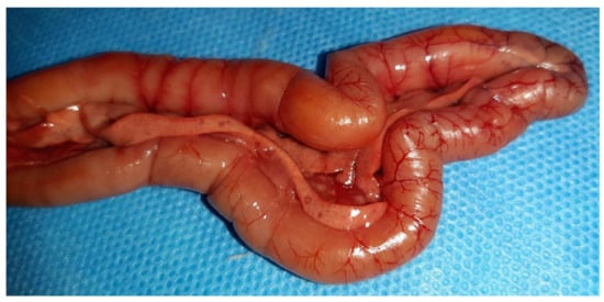 Gross-pathology findings on the pancreas of a 23-day-old broiler chicken, which was submitted for postmortem examination in the Unit of Avian Medicine, Thessaloniki, Greece during the IBH outbreak. The presence of necrotic spots and hemorrhage or/and congestion are visible on the surface of the organ.