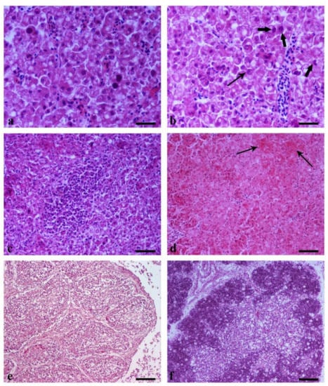 (a) Liver. Fatty degeneration and necrosis of hepatocytes and presence of intensely basophilic intranuclear inclusions bodies. H-E. Bar, 25 μm. (b) Liver. Fatty degeneration and necrosis of hepatocytes. Intranuclear inclusion bodies, eosinophilic surrounded by light halo (thin arrow) and basophilic (thick arrows), are obvious. H-E. Bar, 25 μm. (c) Liver. Marked centrally located inflammatory cell infiltration consists of lymphocytes, macrophages, plasmacytes, and heterophils. Hepatocytes show fatty degeneration and/or necrosis as well as basophilic intranuclear inclusions bodies. H–E. Bar, 50 μm. (d) Liver. Hepatocyte vacuolar degeneration is prominent, accompanied by areas of coagulative hepatocellular necrosis (arrows). H–E. Bar, 50 μm. (e) Bursa. Atrophy of lymphoid follicles with intense depletion of lymphocytes both in the cortex and medulla. H–E. Bar, 100 μm. (f) Thymus. Lymphoid depletion is prominent mostly in the cortex of the thymus, and interlobular spaces present mild edema and vascular distention. Note the scattered clear areas located mostly in the cortex, some of which contain small dark nuclei, characteristic of apoptosis in lymphoid organs. H–E. Bar, 100 μm.