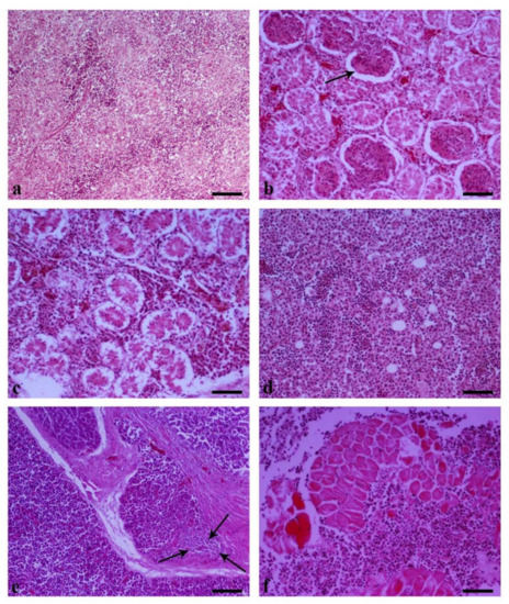 Liver samples from birds collected from Flock A and B showed prominent vacuolar degeneration, areas of coagulative hepatocellular necrosis with intranuclear, large, deeply basophilic inclusion bodies characteristic of adenovirus infection (Figure 8a–c). Multiple samples from the liver of one bird from Flock C revealed the same pattern with those of Flocks A and B. However, inclusion bodies were seldom observed (Figure 8d). In the Bursa, the follicular cortex and medulla were depleted of lymphoid cells (Figure 8e). Thymic atrophy with lymphoid depletion was noted, mainly in the cortex, accompanied with mild edema of the interlobular spaces and vascular distention (Figure 8f). Some mononuclear inflammatory cells and hemorrhages were noted throughout the medulla. Severe depletion of lymphoid follicles also characterized the spleen. Loss of lymphoid cells led to the prominence of reticular cells in the germinal center (Figure 9a). Kidneys showed increased glomerular cellularity due to mesangial cell proliferation (mesangioproliferative glomerulonephritis) (Figure 9b). There was observed tubular epithelial necrosis, interstitial hyperemia and hemorrhages, as well as infiltration of the interstitial connective tissue with mononuclear inflammatory cells (Figure 9c). Bone marrow was characterized by mild depletion with sparse cells throughout the bone marrow presenting nuclear pyknosis and, more often, fragmentation, suggesting the necrosis of bone marrow (Figure 9d). Loss of the architecture of pancreatic lobules was observed due to the absence of acini accompanied by intensely increased interlobular connective tissue and the presence of foci of mononuclear cells aggregates suggestive of chronic inflammation (Figure 9e). Finally, examination of skeletal muscles revealed degeneration, the necrosis of muscle fibers and infiltration of the perimysium and endomysium with mononuclear cells, and heterophils (Figure 9f).