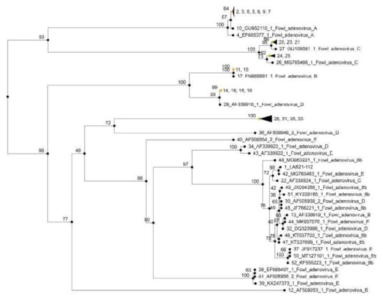 - Niczyporuk, J.S. Adenoviruses and Their Diversity in Poultry. Application of Genetics and Genomics in Poultry Science; IntechOpen: London, United Kingdom, 2018. [Google Scholar] [CrossRef]