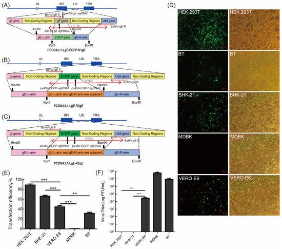 Construction of the BoHV-1 ΔgE donor plasmid and determination of the cell lines for transfection. (A–C) Schematic showing the donor plasmid sequence used to edit BoHV-1 and the re-combination sites inserted into the BoHV-1 genome. The long black arrows represent the sgRNA cleavage site, the short black arrows represent the restriction enzyme cutting site, and the short red arrows and long red arrows represent the primer position and product size, respectively. (D) The transfection efficiency of the empty px458 vector in different cell lines. Fluorescence was evaluated after 48 h. (E) Flow cytometry analysis of HEK293T, BHK-21, VERO E6, MDBK, and BT cell transfection efficiency. (F) BoHV-1 virus titer in different cells. The 80% confluent MDBK, BT, HEK293T, and VERO E6 cells were infected with 10-fold proportional serial dilutions of the virus. There were significant differences between the different cell lines. The data are shown as mean ± SD; ** p < 0.01, and *** p < 0.001.
