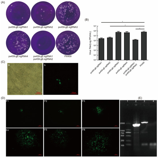 The VERO E6 cells were cultured in 12-well plates until they reached 80% confluence. Two microgram plasmid px459-gE-sgRNA1, px459-gE-sgRNA2, px459-gE-sgRNA3, px459-gE-sgRNA4, and those of the negative control were transfected using Lipofectamine LTX and Plus Reagent, respectively. The cell culture medium was replaced at 6 h after transfection. BoHV-1 (MOI = 1) was inoculated at 12 h after transfection. The viruses were collected 72 h after inoculation. Then, the 10-fold serial dilutions of virus were incubated on 80% of confluent MDBK cells in 12-well plates for plaque testing. The cells were fixed with 10% formaldehyde at room temperature for 4 h 5 days post-infection (pi). The cells were washed three times with phosphate-buffered saline (PBS) and stained with 8% crystal violet for 30 min. Then, the cells were washed and dried. Plaque numbers were recorded and virus titers were calculated (PFU/mL). The experiments were performed three times independently.
