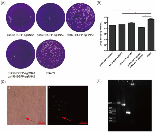 sgRNA of EGFP inhibited the formation of BoHV-1 gE/EGFP+ plaques and the targeted deletion of EGFP. (A) The plaques with different sgRNAs of EGFP. Two micrograms of px459-gE-sgRNA1, 2, 3, or px459 were transfected into VERO E6 cells. After 12 h, the cells were infected with BoHV-1 gE/EGFP+ (MOI = 1) and the virus was fixed and stained for plaque testing at 72 hpi. (B) The virus titer with sgRNA of EGFP editing on MDBK cells. (C) The cytopathic effect and no fluorescence of BoHV-1 gE/EGFP− (Ca) bright field; (Cb) fluorescence field. The red arrow indicates first-generation BoHV-1 gE/EGFP− recombinant viruses. (D) PCR identification of BoHV-1 gE/EGFP−. The purified viral genome was extracted and PCR amplification was performed using BHV-gE-F/R primers. The negative control was double distilled water. Lane 1: DNA marker 2000, lane 2: wtBoHV-1, lane 3: BoHV-1gE/EGFP+, lane 4: BoHV-1gE/EGFP−, lane 5: negative control. The data are shown as mean ± SD; * p < 0.05.