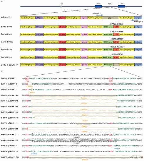 Editing CRISPR/Cas9 induces high-efficiency mutations in the BoHV-1 genome. (A) Summary of representative mutations of BoHV-1 induced with px459-EGFP-sgRNA1 and px459-EGFP-sgRNA2 appearing outside the EGFP sequence. (B) Summary of representative mutations of BoHV-1 induced with px459-EGFP-sgRNA1 and px459-EGFP-sgRNA2 appearing inside the EGFP sequence.