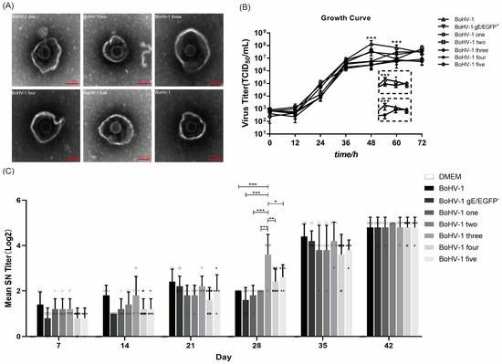 The insertion of genes did not change the replication, morphology or immunogenicity of the virus. (A) After staining with phosphotungstic acid, the morphology of BoHV-1 was compared with that of other mutant viruses using an electron microscope. (B) BoHV-1, BoHV-1 gE/EGFP−, and other recombinant viruses inoculate MDBK cells at 0.01 MOI. At 12, 24, 36, 48, 60, and 72 hpi after inoculation, the Karber method was used to calculate the virus titer and draw the virus growth curve. Windows shows the respective titers of parental BoHV-1, mutant three and four at 48, 60 and 72 h post infection. (C) The virus was injected intramuscularly, and the second immunization was performed at 21 d after the first immunization. Serum was collected every 7 days after the initial immunization to detect specific neutralizing antibodies against BoHV-1. *** p < 0.001, ** p < 0.01, * p < 0.05. Each graph represents the neutralizing antibody titer of each mouse in different immunization groups. Circle: BoHV-1; Square: BoHV-1 gE/EGFP−; Diamond: BoHV-1 one; Hexagon: BoHV-1 two; Inverted triangle: BoHV-1 three; Left half-solid hexagon: BoHV-1 four; left half filled diamond: BoHV-1 five.