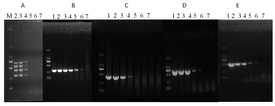 mRT-PCR assay sensitivity. The sensitivity of mRT-PCR and sRT-PCR assays was checked using 10-fold serially diluted plasmids containing SaV, EMCV, RVA and AstV fragments as a template. M: DL2000 DNA Marker, 1: 2.5 × 106 copies, 2: 2.5 × 105 copies, 3: 2.5 × 104 copies, 4: 2.5 × 103 copies, 5: 2.5 × 102 copies, 6: 2.5 × 101 copies and 7: 2.5 × 100 copies. (A) mRT-PCR, (B) SaV, (C) EMCV, (D) RVA, and (E) AstV.