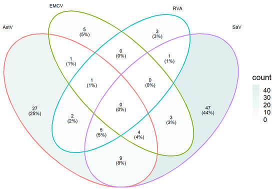 The number of single and mixed infections of Ast, EMCV, RVA and SaV. The coinfection rate of each virus was calculated using 100 samples that tested positive for at least one virus.
