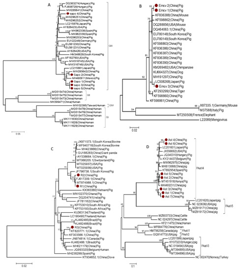 Phylogenetic analysis of SaV, EMCV, RVA and AstV. The strains identified in this study (marked with red dots) and reference strains from GenBank were used to construct phylogenetic trees. Scales indicate units of the number of base substitutions per site. (A) Phylogenetic tree of SaV. The tree was built using 224 positions from the ORF1 region of SaV. (B) Phylogenetic tree of EMCV. The tree was constructed using 211 positions from the 3D region of the EMCV. Mengovirus was used as an outgroup. (C) Phylogenetic tree of RVA. The tree was built based on 545 positions of the VP6 region. Rotavirus A from dove (avian) was used as an outgroup. (D) Phylogenetic tree of AstV. The tree was built based on 379 positions of the ORF1ab region. As an outgroup, Turkey (avian) Astrovirus is included.