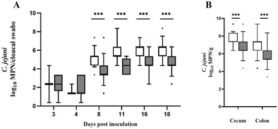 For the experiments, an inoculum containing 3.4 × 104 cfu of C. jejuni was prepared and analyzed as described earlier []. Seeders were then orally inoculated individually into the crop with 0.5 mL of the prepared bacterial suspension.
