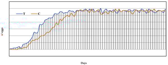 Egg production curve for a total of 12 weeks of laying, corresponding to the 7th to 19th week of the trial, expressed as day of laying. T = supplemented hens (n = 60); C = control hens (n = 60).