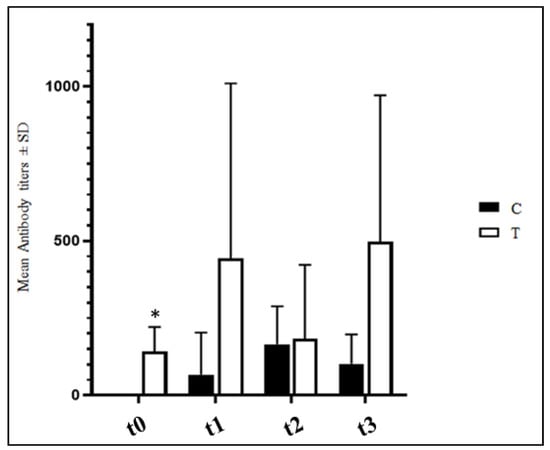 ELISA anti-IBV antibody titers detected in four samples per experimental group are reported in Figure 2. No significant differences were observed between the C and T groups (p > 0.05) with the sole exception of t0 when the hens of the T group presented significantly higher anti-IBV antibody titers (p < 0.05).
