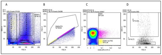 Heterophils and Lymphocytes percentage was assessed using a single staining CD45-APC (Invitrogen, Carlsbad, CA, USA), no-lyse no-wash method, as described by Seliger and colleagues []. Briefly, 20 µL of fixed-EDTA-blood were diluted with 980 µL of PBS 1X, then 100 µL of the diluted blood sample were mixed with 0.5 µL of CD45-APC antibody in a tube and incubated for 45 min in the dark at +4 °C. Negative controls, to evaluate inherent background or auto fluorescence, were obtained omitting primary antibodies. Subsequently, 400 µL of PBS 1X were added and samples were kept on ice and protected from light until analyses. From each sample 100 µL were analysed by MacsQUANT® Analyser 10 (Miltenyi Biotec, Bergisch Gladbach, Germany). Data were analysed using the Flowlogic software (Inivai Technologies, Mentone Victoria, Australia). To start, not only debris but also artefacts (very high FSC-A) were excluded using forward (FSC-A) vs. side scatter (SSC-A). Doublets exclusion was achieved by plotting FSC-area vs. height (FSC-A/FSC-H). CD45-APC positive singlets population was gated and plotted on forward scatter (FSC) and side scatter characteristics (SSC) as described by Naghizaden and colleagues [].