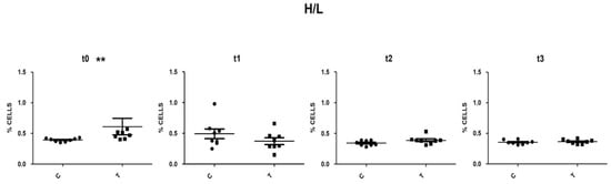 Scatter plot of H/L ratio in C and T group at t0, t1, t2 and t3. **: statistically significant (p < 0.01). T = supplemented hens (n = 60); C = control hens (n = 60); H/L = heterophils/ lymphocytes ratio; t0 = start of the trial; t1 = after 5 weeks of supplementation; t2 = end of supplementation; t3 = end of the trial.