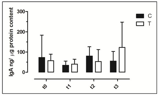 Concentration of Immunoglobulin A (IgA) in faecal swabs. The data are reported as mean ± SD. T = supplemented hens (n = 60); C = control hens (n = 60); t0 = start of the trial; t1 = after 5 weeks of supplementation; t2 = end of supplementation; t3 = end of the trial.