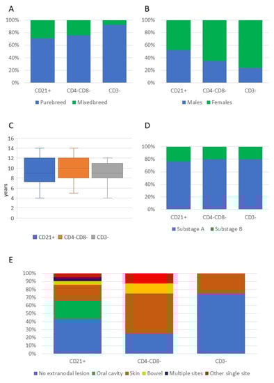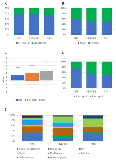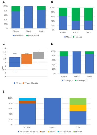 Breed (A), sex (B), age (C), substage (D), and presence of extranodal lesions (E) in 152 dogs with T-cell lymphoma not otherwise specified, according to the three most common phenotypic aberrancies.