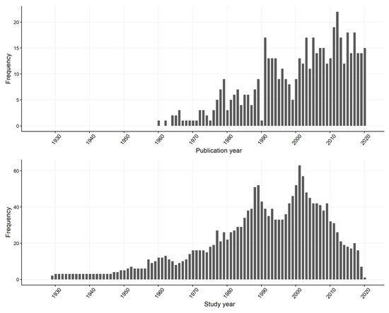 Distribution of the 514 studies captured from a scoping review of reported causes and syndromes associated with mid to late-term pregnancy loss in horses by (top) year of publication and (bottom) year of data collection from 1960–2020.