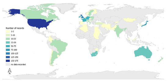 Most records were descriptive studies (72%, n = 370), followed by analytic observational studies (11%, n = 58), outbreak investigations (6%, n = 31) and comparative experimental studies (5%, n = 29). Records in the category of ‘other’ (6%, n = 30) included studies on the diagnostic investigations of specific pathogens able to cause equine abortion or pathogens discovered in abortion cases. The country of data collection was recorded in 446 records (87%) (Figure 3). Ninety-four records had data collected from more than one country (18%). Of these, 225 records (50%) included locations within countries. Most records collected data from Europe (n = 409), North America (n = 203) and Asia (n = 102).