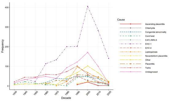 When examining records for temporal trends in reported causes over time (Figure 4), the earliest reported causes in the 1930s were twinning, umbilical cord torsion and unspecified causes. EHV-1 appears in records in the 1940s, congenital abnormality appears in the publications in the 1950s, and the first descriptions of placentitis and leptospirosis appear in the 1960s. Ascending placentitis and nocardioform placentitis both entered into the literature in the 1990s. Records on twinning, leptospirosis, EHV-4 and congenital abnormalities peaked in the 1990s. Chlamydia and EAFL/MRLS entered the literature in the 2000s, with records on EHV-1, unspecified causes and other miscellaneous causes peaking in the 2000s.
