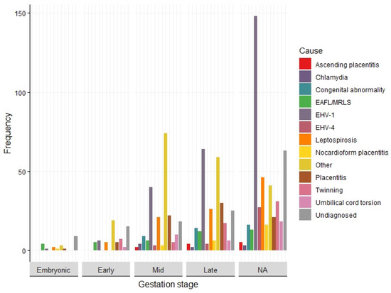 The stage of gestation within which the abortion or stillbirth occurred was recorded reported in 301 records (59%). Early-, mid- and late-gestation loss was reported in 66 (22%), 181 (60%) and 206 (68%) records, respectively. Although not an inclusion criterion, embryonic pregnancy loss was reported in 25 records (8%) in conjunction with losses at other stages of pregnancy. During early and mid-gestation, the most frequently reported cause of pregnancy loss were miscellaneous causes (n = 19 and n = 74, respectively). The next most frequent cause reported during mid foetal gestation was EHV-1, followed by placentitis and leptospirosis (n = 26 and n = 21, respectively). In late gestation, EHV-1 was the most frequently reported cause (n = 64), followed by miscellaneous causes (n = 59), placentitis (n = 39) and leptospirosis (n = 26) (Figure 5).