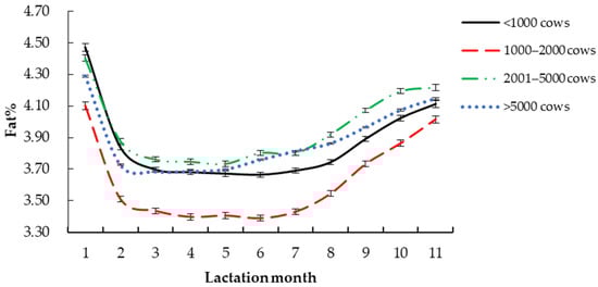 Wang et al. [] and Zhang et al. [] have shown that the size of farm has a significant effect on the parameters of the Holstein lactation curve model. Kuevi et al. [] found that the size of the dairy farm had a significant effect on the milk fat percentage of dairy cows. This study found that the farm size had a certain effect on the Holstein milk fat percentage Wood lactation curve model parameters. Large-scale dairy farms adopt modern equipment and more meticulous feeding management to shorten the period of milk fat percentage declining before the peak period of cow intake. Therefore, dairy farms with more than 5000 cows have the shortest Tmin and the highest milk fat percentage. Related studies have shown that large-scale farm equipment has a high degree of mechanization, and that the establishment of a digital standardized management system can enable various departments to cooperate with each other, to have strong technical strength of operation, and to diversify the types of formulations, which is helpful for improving the lactation performance and efficiency of dairy cows [,]. Cows in large-scale dairy farms have been improved by standard and scientific breeding, and their genetic basis and production performance have improved. Holstein cows’ milk fat percentage curve, with a size of less than 1000, has the highest R2, the greatest Per, and the greatest potential of milk fat percentage. Small-scale pastures generally have a low degree of mechanization; although the number of cattle is small, the management of individuals is more thorough. On the other hand, medium-sized farms may be using low mechanization and poor cattle management, because of cost considerations; besides, the DHI records of medium-sized farms are not comprehensive. This may be the reason why 1000–2000 pastures have the lowest R2, the least Per, and the least potential of milk fat percentage. Therefore, the management of medium-sized pastures should be strengthened to ensure lactation performance.