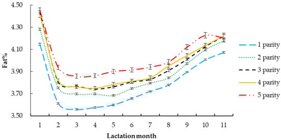 This study found that the R2 of the fifth parity dairy cow was the smallest, the Ymin was the highest, the Per was the highest, and the lactation potential was the greatest. The R2 of the first parity dairy cow was the highest, the Ymin was the lowest, the Per was the lowest, and the potential of the milk fat percentage was the least. Roberto et al. [] found that the parameters of the population lactation curve fitted by the Wood model were significantly affected by parity, and that the lactation potential of first-born cattle was low. The change of milk fat percentage of the first parity cows was relatively small, and the data were limited, which may be due to the fact that the majority of the first parity cattle had just reached body maturity. The dairy cows’ body development was not perfect, and the nutrient intake required to maintain the dairy cows’ energy consumption and tissue development wass not good, resulting in poor milk fat percentage. For first-born cattle, the potential of milk fat percentage was low, the milk fat percentage increased slowly in the later stage of lactation, and the Per was strong, which was consistent with the findings of Rao and Sundaresan []. High-parity cows had a small R2 because some individuals showed superior production performance, and there were significant differences between individuals. Capuco et al. [] and Val-Arreola et al. [] found that milk fat percentage increased significantly with the increase of parity, which was consistent with the findings of this study, and that lactation performance reached its peak at the fifth fetal stage. Amongst all the parities, Holstein cattle of the third parity first reached the lowest point of milk fat percentage and then increased the fastest, and this showed that the body recovery ability of dairy cows with third parity was the fastest, such that they could quickly eliminate negative effects after calving, and enter a state of efficient production. Knaus et al. [] and Oltenacu et al. [] showed that the average calving number of dairy cows in Austria and the United States was 3.3 when they were eliminated. Yan et al. [] found that the average calving number of Chinese Holstein cattle was 2.86 when they were eliminated. Therefore, the productive lifetime of the dairy cow should be improved to improve the actual production income.