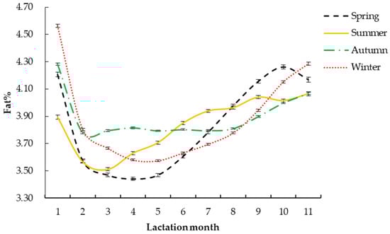 The lactation curves and fitting parameters of different calving seasons are shown in Figure 3 and Table 4. Among them, the R2 of the milk fat percentage curve of calving in autumn was the highest (0.9720). The Ymin of calving in autumn was the highest (3.65%), and that of calving in spring was the lowest (3.36%). The Tmin for Holstein calving in autumn was the highest (137 days). The Per of calving in spring was the lowest (3.24). The a and b of the lactation curve of Holstein calving cows in winter were the largest, 4.07 and 0.35, respectively, and the c was lowest in autumn (0.03).
