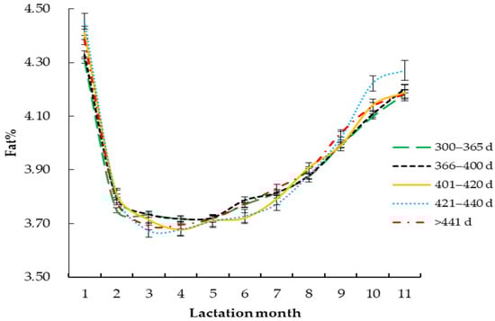 where Yijklmn is the observed value of milk fat percentage; Fi is the fixed effect of dairy farm size; Pj is the fixed effect of parity; Sk is the fixed effect of calving season; Dl is the fixed effect of calving interval; Nm is the fixed effect of 305-days milk yield; and eijklmn is a residual random effect. The multiple comparisons between different levels of factors were made by Duncan’s method. The lactation month was divided into 1 lactation month every 30 days, and more than 300 days was the last lactation month, a total of 11 lactation months. The significance level was defined as follows: p ≤ 0.01, that the difference was extremely significant; p ≤ 0.05, that the difference reached a significant level; p > 0.05, that the difference was not significant. According to the above factors and levels affecting the daily milk fat percentage, the corresponding data were selected, the Wood lactation curve was fitted by the method mentioned above, and the corresponding parameters were calculated.