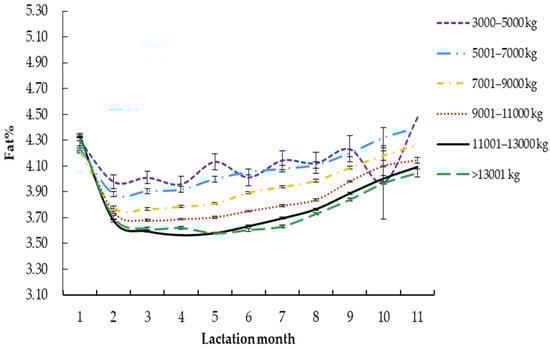 Baiyila [] showed that the difference in milk yield over 305 days had a certain effect on the Wood lactation curve model. This study found that the R2 of Holstein cattle was the highest when the 305-days milk yield was 5001–7000 kg. Among them, the milk fat percentage of Holstein cattle with a 305-days milk yield of 3000–5000 kg was the highest, and it was found that the milk fat percentage decreased significantly with the increase of milk yield. Umphrey et al. [] and Liang et al. [] showed a significant negative correlation between milk yield and milk fat percentage. The Holstein cows with 305-days milk yield above 13,001 kg were high-yield dairy cows; the results showed that the lactation potential of this kind of dairy cow was the best, the speed of reaching and rising from the lowest point of milk fat percentage was the highest, and Ymin was the highest. However, related studies [,] have shown that high-yield dairy cows may increase their own diseases at the same time as high milk yield, implying that some high-yield dairy cows may get sick, which may affect the milk fat content during lactation, resulting in great individual differences amongst individuals as a whole; this may be the reason for the least R2. The Holstein cattle with milk yield of 3000–5000 kg reached the lowest point of milk fat percentage at the slowest speed, and the speed of rising from the lowest point was the least, this may be due to the decline of lactation performance in some Holstein cattle due to heredity and disease, and the specific reasons need to be further studied.