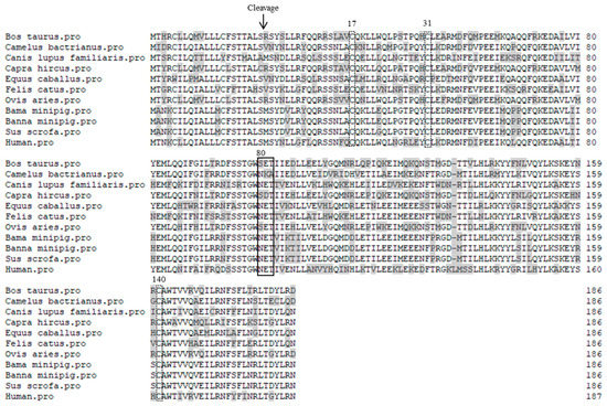 Genomic DNA was extracted from the spleen tissues of Banna and Bama miniature pigs using Genomic DNA Extraction Kit (Tiangen Biotech, Beijing, China). The coding regions of PoIFN-βs were amplified from the genomic DNA using High-Fidelity PCR Taq System (TaKaRa, Beijing, China) with primers listed in Table 1. The amplicons were cloned into pMD19-T TA cloning vector (TaKaRa, Beijing, China) and transformed into DH5α E. coli. The amplicon-containing vectors were prepared and sequenced in two directions using vector sequencing primers (TaKaRa). The obtained sequences were assembled using the SeqMan program (DNASTAR Lasergene, Madison, WI, USA), and the consensus open reading frames (ORFs) were translated into the amino acid sequences using the EditSeq program. The translated sequences were blasted against PoIFN sequences in GenBank for homology, conserved cysteine residues and potential N-glycosylation sites using the BLAST algorithm (https://blast.ncbi.nlm.nih.gov/Blast.cgi, accessed on 2 December 2022). The amino acid sequences were further aligned with that of 11 different animal species (Supplemental Table S1) for sequence homologies (Clustal W scores) using the MegAlign program [22].