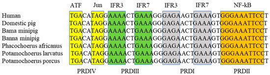 Sequence alignment of the promoter domains in PoIFN-β of different pig species. The promoter domains (PRDs) in PoIFN-β of two Chinese miniature pig breeds were identical with that of humans, domestic pigs, and African wild boars.