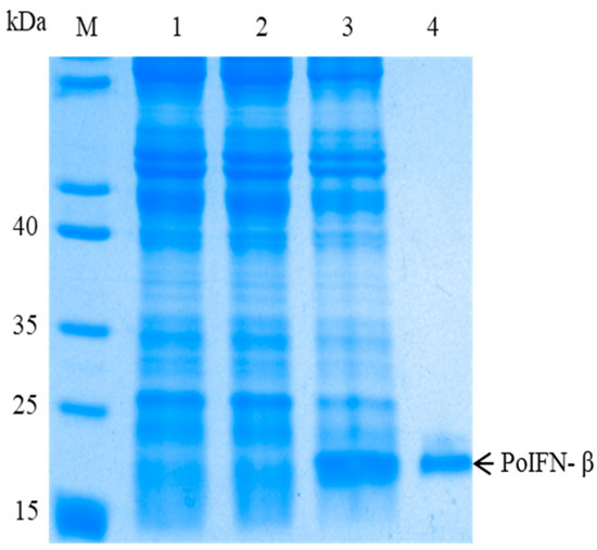 Expression and purification of rPoIFN-β from Bama miniature pig. The protein samples were run on 12% SDS-PAGE. 1–4 indicate pET-30a-tansformed E. coli, pET30a-PoIFN-β transformed E. coli before IPTG induction, pET30a-PoIFN-β transformed E. coli after IPTG induction and purified rPoIFN-β, respectively.