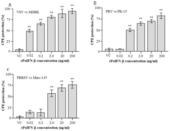 Detection of pre-infection antiviral activities of rPoIFN-β. Three cell lines (A–C) were treated with the indicated concentrations of rPoIFN-β for 24 h and then infected with the three pig viruses. The pre-infection antiviral activities were measured in triplicates by CPE inhibition assay. ** indicates significant difference (p < 0.01) in CPE protection of rPoIFN-β as compared with the virus control (VC).