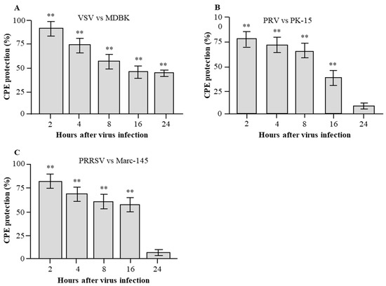 To detect the post-infection antiviral activities of rPoIFN-β, MDBK, PK-15 or Marc-145 cells were infected with VSV, PRV or PRRSV, and then treated with a fixed concentration (20 ng/mL) of rPoIFN-β at different time points post-infection. CPE inhibition assay showed that rPoIFN-β exhibited post-infection antiviral activities against the three pig viruses, which declined as the time extension of virus infection (Figure 6). At 2 h post-infection, treatment with rPoIFN-β showed 91% CPE protection in VSV-infected cells, 78% CPE protection in PRV-infected cells or 74% CPE protection in PRRV-infected cells, which declined to 45%, 11%, and 7% protection by 24 h post infection, respectively.