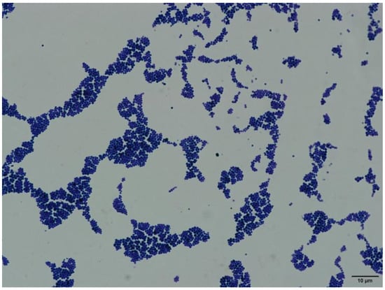 Under an oil immersion microscope (1000× magnification), the bacteria appeared as Gram-positive cocci and the cells were small and uniformly ovoid-shaped spheres with diameters ≥ 1.0 µm (Figure 2).
