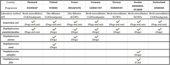 Summary of AMR surveillance programmes in the European Union. AST: ANTIBIOTIC Susceptibility Test; CLSI: Clinical Laboratory Standards Institute. Adapted from []. √: it indicates the bacteria included in each AMR surveillance program.