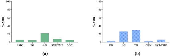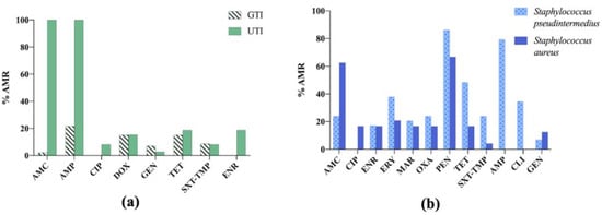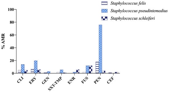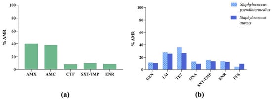 The results of the latest report showed a high AMR level to amoxicillin and amoxicillin–clavulanic acid in E. coli isolates. Moreover, the percentage of resistant S. pseudintermedius isolates was high for all the antibiotics tested [] (Figure 5).