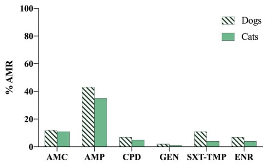 The results are shown in Figure 6. Within them, it is important to highlight that 100% of E. coli strains isolated from urinary tract infections (UTI) in cats were resistant to ampicillin and amoxicillin–clavulanic acid, whereas for dogs, the figures were below 20% [].