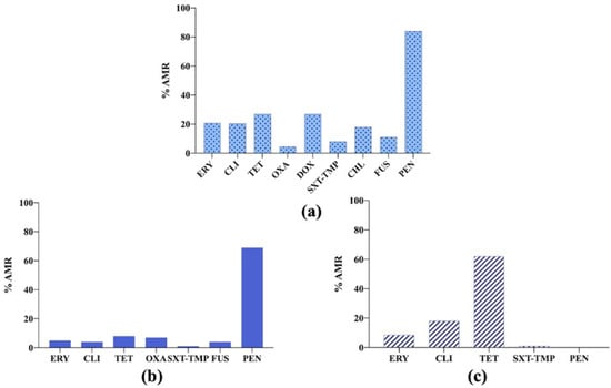 (a) Antimicrobial resistance (AMR) prevalence in Staphylococcus pseudintermedius isolated from dogs in Finland. ERY: erythromycin; CLI: clindamycin; TET: tetracycline; OXA: oxacillin; DOX: doxycycline; SXT-TMP: sulfamethoxazole–trimethoprim; CHL: chloramphenicol; FUS: fusidic acid; PEN: penicillin. (b) Antimicrobial resistance (AMR) prevalence in Staphylococcus aureus isolated from dogs in Finland. ERY: erythromycin; CLI: clindamycin; TET: tetracycline; OXA: oxacillin; SXT-TMP: sulfamethoxazole–trimethoprim; FUS: fusidic acid; PEN: penicillin. (c) Antimicrobial resistance (AMR) prevalence in Staphylococcus canis isolated from dogs in Finland. ERY: erythromycin; CLI: clindamycin; TET: tetracycline; SXT-TMP: sulfamethoxazole–trimethoprim; PEN: penicillin.