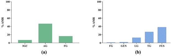 As seen in Figure 7, the highest AMR level in E. coli isolates was to aminopenicillins. However, for S. pseudintermedius, the highest AMR percentage was observed to fusidic acid [,].
