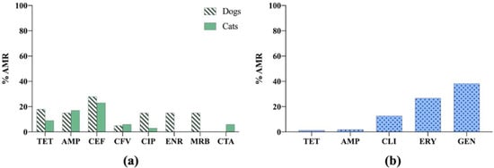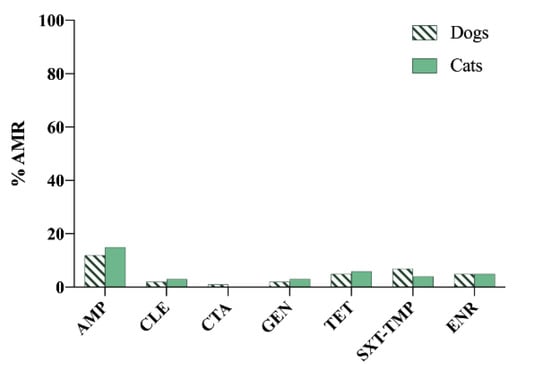 In this study, no major overall changes were found over time, and the results of AMR in cats and dogs are shown together as one (Figure 2) [].