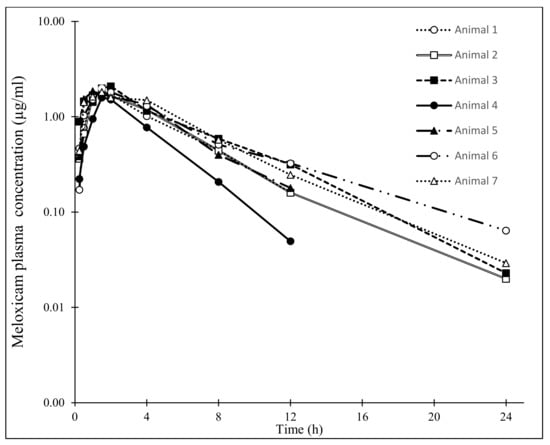 Meloxicam is a cyclooxygenase (COX)-2 selective non-steroidal anti-inflammatory drug (NSAID) that is currently indicated and successfully used in the therapeutical management of a wide range of companion and exotic animal species, due to its great selectivity for COX-2, good absorption through oral (PO) and intramuscular (IM) routes, and wide safety margins [,]. However, pharmacokinetics (PK) of meloxicam have shown great variations among the species studied to date (mainly mammals, avian and reptile species), with significant differences in the dosages required to achieve clinically effective plasma concentrations and important variations in half-life and clearance [,]. In all the studied species, once meloxicam is absorbed, it is metabolized mainly in the liver via cytochrome p450 (CYP) enzymes, transformed into four inactive metabolites and eliminated in feces and urine [,]. Previous studies provide evidence that pharmaceutical and xenobiotic-metabolization via CYP enzymes, including NSAIDs, should be carefully studied before extrapolation across taxa, as fish CYPs have proven to respond differently compared to mammals []. These differences are important, as they can influence the speed at which some drugs are metabolized and eliminated, affecting clearance rates and leading to variations in the kinetic properties or toxic effects of those drugs that undergo liver metabolization [,]. PK studies aim to examine how the concentration of a drug evolves over time, determining the amounts of that drug and its metabolites in the tissues of different species, their fluids, and excrements []. In addition, PK studies also help the clinician to adjust the drug dosages and inter-dosage periods and allows the prediction of the results obtained during a pharmacological treatment, since pharmacological response is determined by the ability of the drug to access the sites of action and drug concentration over time []. PK behavior can show great variations between species, even if these species are very close phylogenetically [].