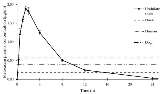 The determination of the meloxicam clinical effective concentration in undulate skates was not the objective of the present study, and in the absence of studies determining the effective meloxicam plasma concentrations required for COX-2 inhibition in fish, further studies investigating the pharmacodynamics of meloxicam in rays and sharks are required. The mean meloxicam plasma concentration at 8 h after administration was 0.51± 0.04 μg/mL in undulate skates, which is over the 0.39 μg/mL meloxicam plasma concentration described in dogs for analgesic/anti-inflammatory effects []. In addition, the mean plasma concentration at 12 h post-administration was 0.25 ± 0.03 μg/mL, which is still over the mean inhibitory concentration of COX-2 described in other animal species, such as horses (0.13 to 0.19 μg/mL), potentially leading to clinically relevant concentrations for longer periods []. However, the current therapeutical management of fish tries to minimize handling as much as possible, in an effort to reduce stress and the risk of trauma related to animal capture for drug administration []. In this sense, inter-dosage periods requiring handlings as frequent as every 8 h, although achievable in small and resilient species, such as the undulate skate, could be too frequent for some easily stressed elasmobranch species, and could be counterproductive []. Prolonged release meloxicam injectable formulations have provided a longer t1/2β in mammalian vertebrates, compared to the conventional injection solution used in this study []. Although prolonged release meloxicam formulations are still not evaluated in elasmobranchs, given the important differences observed in PK parameters, the good absorption and fast elimination after IM administration, further studies with prolonged release formulations together with viability studies could result in longer inter-dosage periods, which could benefit the therapeutical management of some elasmobranchs and teleost fish species.