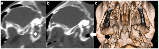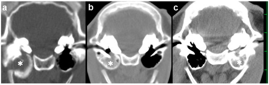 A 1-month-old male Japanese Black calf with a body weight of 35 kg suddenly presented a head tilt toward the right, right ear droop, and bilateral horizontal nystagmus. Severe depression was also evident, together with declined physical performance. The calf’s difficulty in standing was suspected to be associated with vestibular ataxia. On admission, because of the quick development of the clinical signs, the severity of the neurological findings was scored 7 [9]. On the preoperative CT, the hyperattenuating contents were seen in the entire right tympanic bulla, in which the wall structures were not thickened and extended (Figure 1b). No difference between the left and right tympanic bulla was found in the height (17.4 mm vs. 15.7 mm), the width (28.5 mm vs. 27.2 mm), the length (26.1 mm vs. 23.0 mm), or the thickness (1.6 mm vs. 2.4 mm), respectively (Table 1). These four values were almost similar to the measurements from the five Japanese Black calves (in order, 21.0 ± 2.0, 26.2 ± 2.6, 22.6 ± 2.4, and 1.9 ± 0.3 mm, respectively).